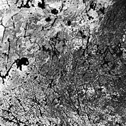 A plot of megalineament orientations (Figure T-15.1 and T-15.2) within the two principal provinces reveals significant differences. A north-northeast trend in strike characterizes Superior rocks and a north-northwest trend marks those of the Grenville. The east-northeast secondary trend noted in the two rose diagrams is associated with the boundary zone between provinces. Most visible lineaments owe their expression to glacial scouring of zones of weakness (such as close-spaced fractures), which produced depressions later filled with lakes (Figure T-15.3) (black in Landsat IR images) or bogs (darker gray).