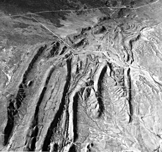 The Plate image displays topographically several characteristics of continental collision orogenic belts. Most obvious is that the rocks are complexly folded and thrust-faulted. Rock sequences are repeated, anticlines encroach upon anticlines, and synclines encroach upon synclines. These exemplify extreme compressive deformation and imply substantial crustal shortening. Figure T-30.2 and Figure T-30.3, aerial photographs taken over the Moroccan Atlas, offer two striking examples of the zig-zag ridges and plunging anticlinal (long, gentle) and synclinal (short, steep) noses formed by resistant rock strata. This style of deformation is common to the layered sedimentary cover of all major fold belts.