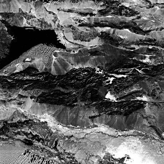 The Large Format Camera photograph in the lower half of the Plate shows a segment of the Altyn Tagh fault about 500 km west of the center of the mosaic image. The large and small folds north of the main trace of the fault suggest that there is a substantial amount of compression across the fault and perhaps a considerable thrust component to movement at this locality. The snow-covered mountains of the Tibetan Plateau tower 5000 m above the Tarim Basin. The numerous closed basins (lakes) and complex pattern of ridges on the plateau (west end of the Kunlun fold belt) attest to recent deformation.