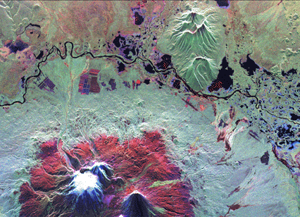 SIR-B operated in 1984 over eight days aboard another Shuttle mission. It differed from SIR-A in having a variable look angle that ranged between 15° and 55° . In April and October of 1994, a more versatile system flew twice on Shuttle missions. This system was JPL's SIR-C, which had L- and C-band radars, each capable of HH, VV, HV, and VH polarizations, and an X-band (X-SAR) instrument, supplied by German and Italian organizations, that was in the VV mode. All of these radars had variable look angles that imaged sidewards between 20° and 65° , producing resolutions between 10 and 25 m. One advantage of this multiband system was the ability to combine different bands and polarizations into color composites. JPL's SIR-C Web Site describes how to create composites. You can reach it by clicking here. It contains a wealth of information and imagery, including our next set of images showing the Kliuchevskoi Volcano in Kamchatka (Russian Siberia) as captured by SIR-C in three polarization modes.