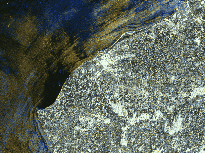 Next, we show a multiband (multifrequency) image of San Francisco, CA, made from L bands HH (red) and HV (green) and C band HV (blue). Its one of the most pleasing images to the eye and it shows the city layout, which is a prime example of why so many people want to live in the Bay Area after visiting it.