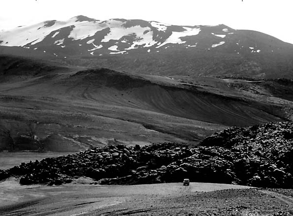 As expected for a spreading ridge, halves of Iceland are diverging at a rate of 0.6 to 2.0 cm/year from the Central Axial Graben. In this scene, two arms of the graben (Western and Eastern Volcanic Zones) extend northeast-southwest before joining in a single north-south branch just above the image. Here the plateau basalts are broken into a series of tilted blocks (horsts/grabens) of shallow depth and moderate vertical displacements. Mainly within the rift zones are numerous en echelon fissures (gjár) (A) from a few meters to 1 km in width; sheet basalts with innumerable vertical dikes are common within and beyond the faults.