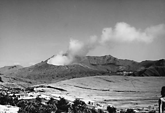 The volcanoes of Kyushu (Matumoto, 1963) lie along the West Japan Volcano Belt that extends southwestward through the Nansei (Ryukyu) Islands. The Aso Volcano is a Valles-type caldera (20 km maximum dimension) formed by multiple collapses as pyroxene andesites ashflows were ejected during Late Tertiary through Pleistocene times. Ignimbritic ashflows, pumice, and other pyroclastics (some water-saturated, producing so-called "mud lavas") filled river valleys and extend almost across the island (light tones near caldera walls are ashbeds) (Yoshikawa et al., 1981). Views of Mount Aso, a post-collapse crater within the caldera, are presented in Figure V-24.1 and Figure V-24.2. Mt. Unzen, Mt. Kuju, and others in the Landsat scene, marked by V's, are dissected Quaternary stratocones that erupted lavas and ash of hornblende andesite composition.