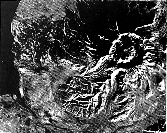 Both this Plate and the superb aerial radar mosaic (Figure V-9.1) highlight the Aniakchak caldera on the Alaskan Peninsula. This still-active volcano, once more than 2000 m high and nearly 40 km wide at its base, sits on a plains just north of the AleutianRange, a folded sequence of Jurassic, Cretaceous, and Tertiary sediments mixed with volcanic tuffs, agglomerates, and flow units. The eruptive collapse (in Early Pleistocene?) that formed the present 9.5 km diameter, 1000 m relief crater, has expelled ash over 2500 km2 to thicknesses of 100 m or greater in the preexistent gullies and valleys on and beyond the original volcano. Ashflows actually move up onto slopes of the Aleutian Range. The glaciofluvial deposits that mantle the lowlands on the Bering Sea side are covered by this ash near the crater, as evidenced by the sharp decrease in numbers of lakes in the vicinity of Aniakchak. Aniakchak Crater (Figure V-9.2), whose nature was not fully discovered until it was entered by surveyors in 1922, is breached by the Aniakchak River that drains the small Surprise Lake at a gap called the Gates. Other volcanoes including the older Mt. Kialagak and the active Mt. Chiginagak fall along a line that serves as the central axis of this section of the Peninsula.