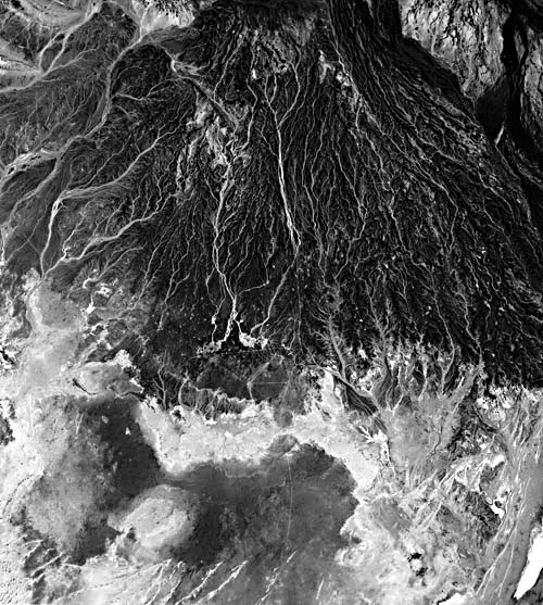 The causes of fan entrenchment, producing the abandonment of old fan surfaces, remain the subject of considerable debate among geomorphologists. Classic observations in the Gobi Desert by Huntington (1914) led to the hypothesis that high sediment production and low stream discharges resulted in aggravation during relatively dry climatic phases. This was then followed by downcutting when wetter climates led to the stabilization of slopes by vegetation. During wet phases, called "pluvials," streams with increased flow augmented their sediment load by bed incision. Alternatively, some geomorphologists in the western United States have argued that fan-building required a wetter climate to transport accumulated debris (Lustig, 1965). Others note that transitional climatic phases are critical. Weathered mantles produced in a humid phase are mobilized by rare events when the climate changes to an arid one (Hunt and Mabey, 1966). It has also been proposed that fan erosion and sedimentation go hand in hand as elements of a steady-state system. (Denny, 1965). This last hypothesis holds that there is no reason to invoke environmental change to explain alternations of process on alluvial fans. Landsat E-1400-04352-7, August 27, 1973.