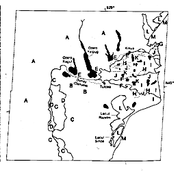 The main channel of the Danube (C) is highly migratory within its alluvial valley, so that numerous meander scars (D) are present within the valley. Small stretches of river braiding are found along the valley course. As the Danube turns abruptly east to form its delta plain, sedimentation has blocked numerous valleys of the north- south-trending topography, forming elongated freshwater lakes (E). Lakes found in the Mackenzie River delta of Canada are formed in the same manner (Figure D-2.l). The major distributaries of the Danube (F) consist of three major channels, the St. George to the south, the Sulina in the middle, and the Kilia to the north (Almazov et al., 1963). The St. George arm is 120 km long and has widths ranging from 200 to 500 m, while the Sulina arm, prior to 1860, had a length of 100 km and a width of 250 m. The Sulina was artificially diked in the period 1860-1895 for navigation purposes. Kilia, the youngest of the distributaries, having formed within the past 600 years, now receives the major part of the flow. It is slightly longer than 100 km and ranges in width from 300 to 700 m. The distributary channels are bordered by well-developed natural levees that are quite narrow, generally less than 250 m wide. Downstream, the natural levees decrease in width and height. Sinuous distributary channels result from migration as the channel cuts through former beach-ridge trends. Like distributaries in many deltas, migration of the channel is controlled by the presence of coarser material. The Kilia distributary to the north is the youngest part of the delta. Numerous bifurcated channels and overbank splays (G) are present, most of which are too small to show up in the satellite image. Offshore of these young prograding distributaries, slope is extremely low, the coastline is very muddy, and beaches are entirely absent.