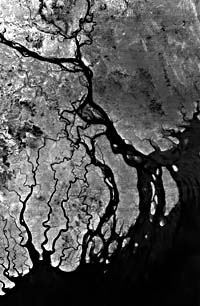 The Ganges is primarily a meandering river, while the Brahmaputra is primarily a braided channel (Plate F-13). Their combined discharge into the Bay of Bengal is approximately 82 000 m3/sec during flood. Sediment load is extremely high, with suspended sediment load during flood stage reaching as high as 13 million tons per day (Coleman, 1969). Figure D-3.1 is a band 5 version of the lower Landsat image in the Plate mosaic that highlights the vast sediment load beyond the mouths of the Ganges. Because the climate within the delta is monsoonal, rainfall is seasonal. Vegetation is highly varied and generally dense in areas that have not been reclaimed for agriculture. The Bengal coast is mesotidal, with an average tidal range of 2 m. Wave energy modifying the coast is relatively low because of the extremely low offshore gradients that front the active delta.