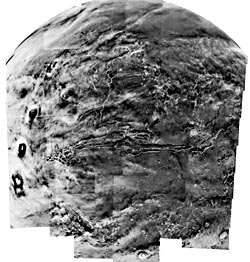 Before leaving this unusually interesting scene, we should call the reader´s attention to the crater at bottom center, south of Ius Chasma. The lobate ejecta blanket around what is presumably an impact crater has no counterpart on the Moon or Mercury. 83-H-244.