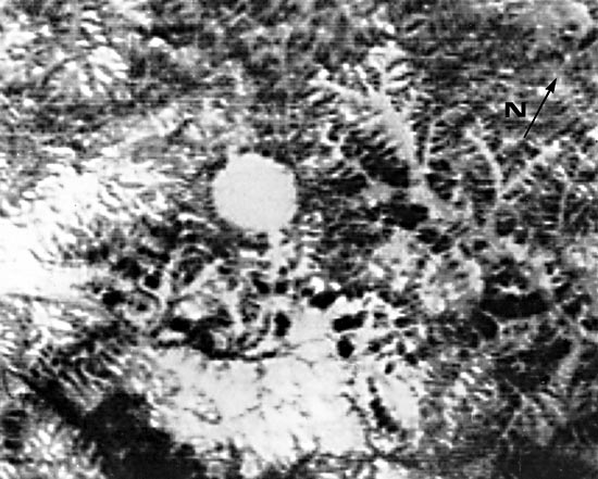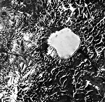 | Figure 12.14a. Aerial photograph of Elgygytgyn Crater, northeastern Siberia, U.S.S.R. (courtesy of B. Ivonov). | Figure 12.14b. Seasat radar image of Elgygytgyn Crater and the surrounding region. |