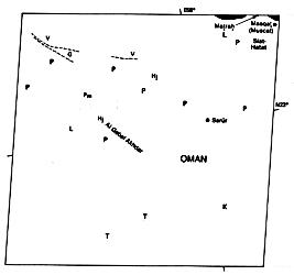 This scene covers much of the Semail ophiolite nappe comprising the Oman Mountains in northern Oman. Peridotites (P) are clearly visible as large dark massive rocks with a characteristic highly dissected drainage pattern. The gabbros (G) are not well represented on this image. Most are easily differentiated by their light color and coarser drainage pattern. Volcanic units (v) rimming the northern perimeter of this south-dipping nappe are distinctive in their dark color and characteristic low relief due to their lack of weathering resistance.