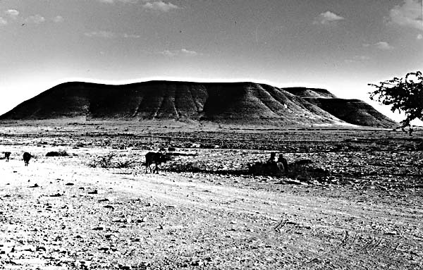 The Baitarani Uplands (lighter toned) are composed mainly of Singhbhum granites. The Uplands comprise an old surface of flat-topped hills. Numerous dolerite dikes (up to 700 m wide) pervade the Uplands, standing out as low ridges (visible as dark lines).