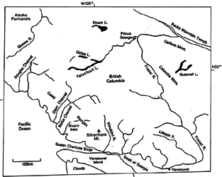 This Plate, a nighttime HCMM thermal image, records a scene that extends 700 km across the southern Canadian Cordillera from the Pacific Ocean almost to the eastern edge of the Rocky Mountains (Wheeler et al., 1972). The tonal patterns, directly tied to sensed temperatures, broadly coincide with different topographic expressions that, in turn, are controlled by structure. These notable variations in topography are surficial evidence of abrupt changes in underlying structures that result from accretion of suspect or exotic terranes to the west side of North America (Jones et al., 1982).