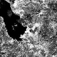 Ararat is typical of the calc-alkaline volcanism that led to the expulsion of dacites and andesites in the region. Younger out-pourings consist of alkali basalts. Related volcanism extends eastward into northern Iran, culminating in the dormant Damavand (5671 m) volcano near Tehran. Another large stratovolcano, Sahand (3710 m) south of Tabriz, is prominent in the Landsat image shown as Figure V-17.2; a smaller volcanic structure, Shaki (2189 m), extends as a peninsula into Lake Urmia. Both show extensive slope erosion, forming barrancos or gorges that help to emphasize the pronounced radial drainage. This pattern is especially brought out in the SIR-A radar image of Sahand seen in Figure V-17.3. Landsat TM 50209-07140, September 9, 1984.