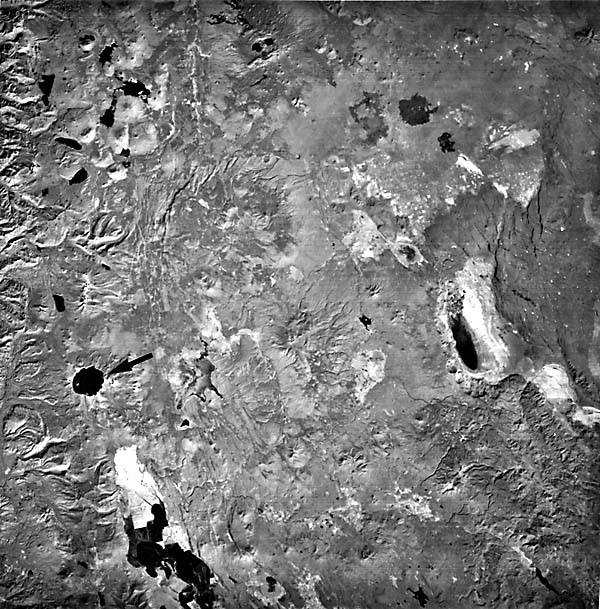 The right half of the scene lies at the southwestward end of the High Lava Plains (Plate V-7); the southern boundary of the Columbia Plateau is just north of this image. In the Plains, northwest-trending faults and narrow rift fractures controlled the extrusion of volcanic rocks. Rocks of Lower Tertiary age intermix with younger flow and tephra deposits around Glass Buttes. The Fremont Mountains consist of dissected Pliocene flow units involved in extensive normal faulting. A series of close- spaced normal faults at (A) generated west-facing scarps in a higher plateau made up of Pliocene volcanic rocks between the depressions occupied by Summer and Abert Lakes.
