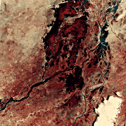 The Niger inland delta serves to spread out the seasonal flows of the river. During the summer flood season, high discharges enter the delta apex. Large areas of open and shallow water are visible north of Mopti. One of these is Lac Debo at the top center of the scene. The flood crest may take 3 months to pass through the marshes, lakes, and channels of the delta.