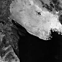 The present Colorado River delta forms inland from where the river empties into the Gulf of California (Plate D-12). The Gran Desierto sand sea lies in a basin about 60 m deep east of the Colorado River. Northwest-southeast-oriented mountain ranges typical of the Basin and Range Province stand both west of the Colorado River floodplain and east of the sand sea. The ranges are sharp-peaked and have broad alluvial fans.