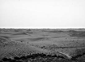 The research station personnel manually leveled dunes to provide experimental agricultural plots. Soil and plant analysis laboratories were built to monitor land changes. Engineering, mechanical, and biologic methods are being studied at the station to determine how best to reduce the damage of windblown sand to the railroad. The most effective method developed thus far is to supplement a planting program by constructing l-m2 straw grids on the dunes, as shown in Figure E-23.2 and Figure E-23.3. The grid system, which is effective up to 7 years, lowers the surface wind velocity by 17 percent. Shrubs and trees planted within the grid are protected by the straw until they take root. Note in Figure E-23.3 that the grid system has changed the profiles of the dunes. Since the implementation of the grid system and planting program, the railroad has remained open, and no serious accidents have occurred.